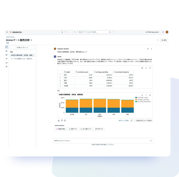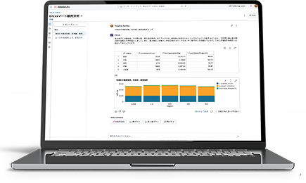 DatabricksにはBI機能があり、ダッシュボードによる定型的な可視化が可能です。さらに自然言語による柔軟なデータアクセスにも対応しており、ビジネスユーザー自身が可視化・深掘り分析までをSQLを使わずに行える環境を提供します。